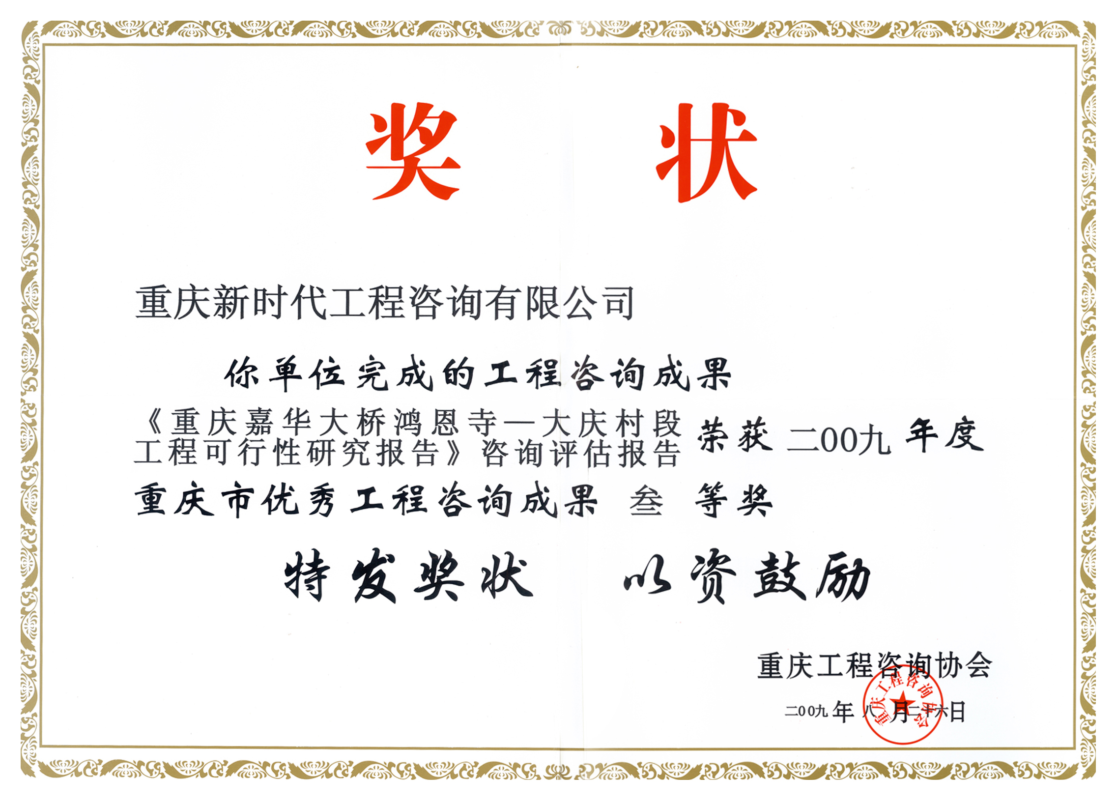 在2009年度重慶市優(yōu)秀工程咨詢成果評選中,我公司承擔的《重慶嘉華大橋鴻恩寺—大慶村段工程可行性研究報告》咨詢評估報告榮獲優(yōu)秀咨詢成果三等獎。