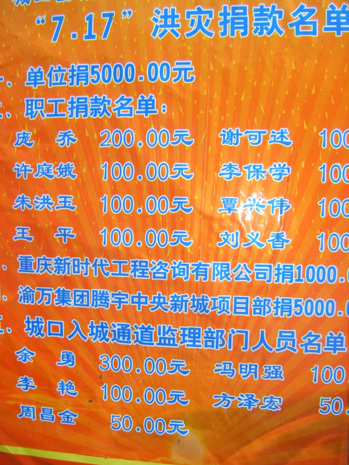 洪災(zāi)無情,人間有愛。在“7.17” 洪災(zāi)捐款活動(dòng)中,公司和城口項(xiàng)目監(jiān)理部全體人員紛紛向?yàn)?zāi)區(qū)伸出援助之手,表達(dá)了自己的一份愛心。