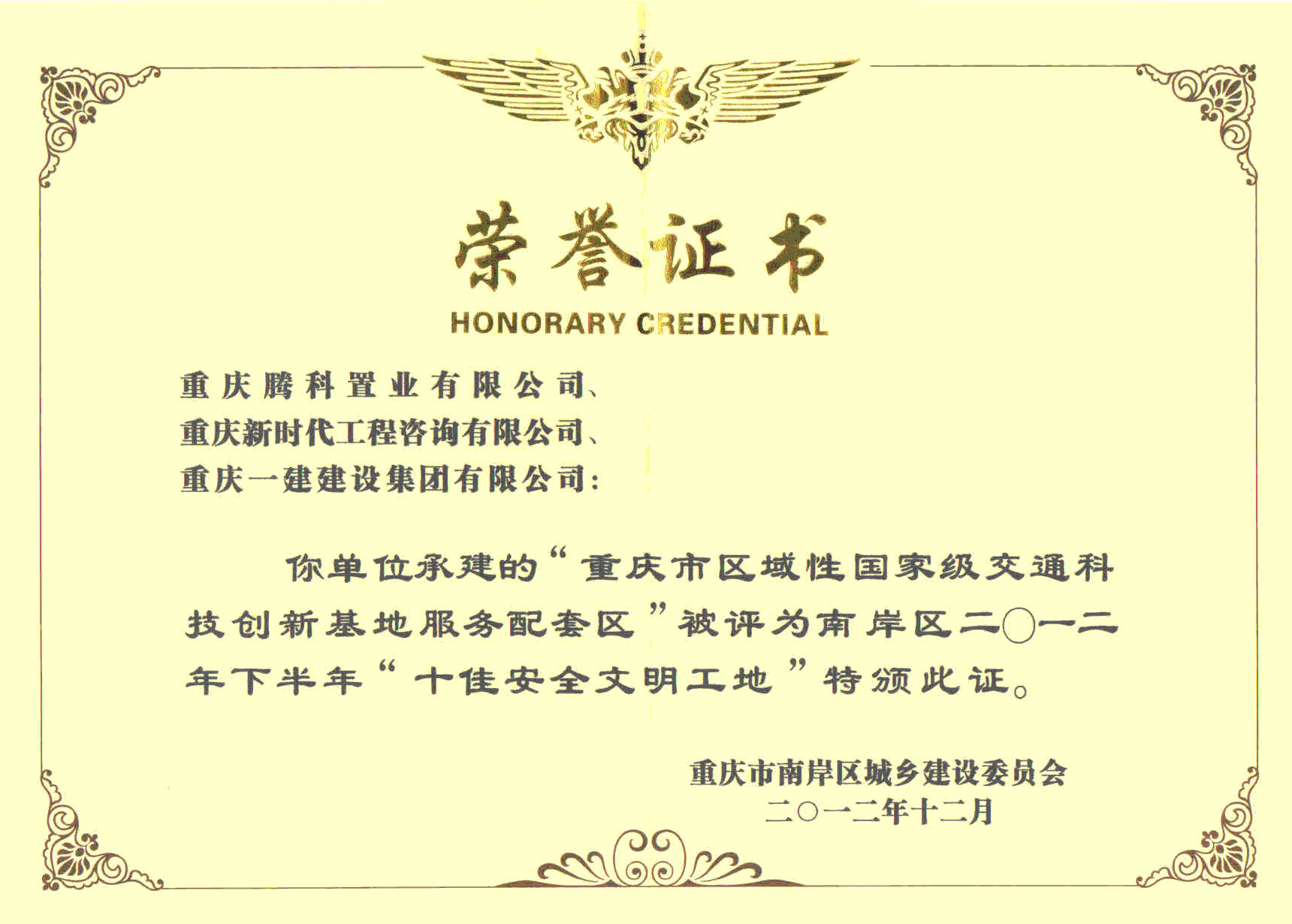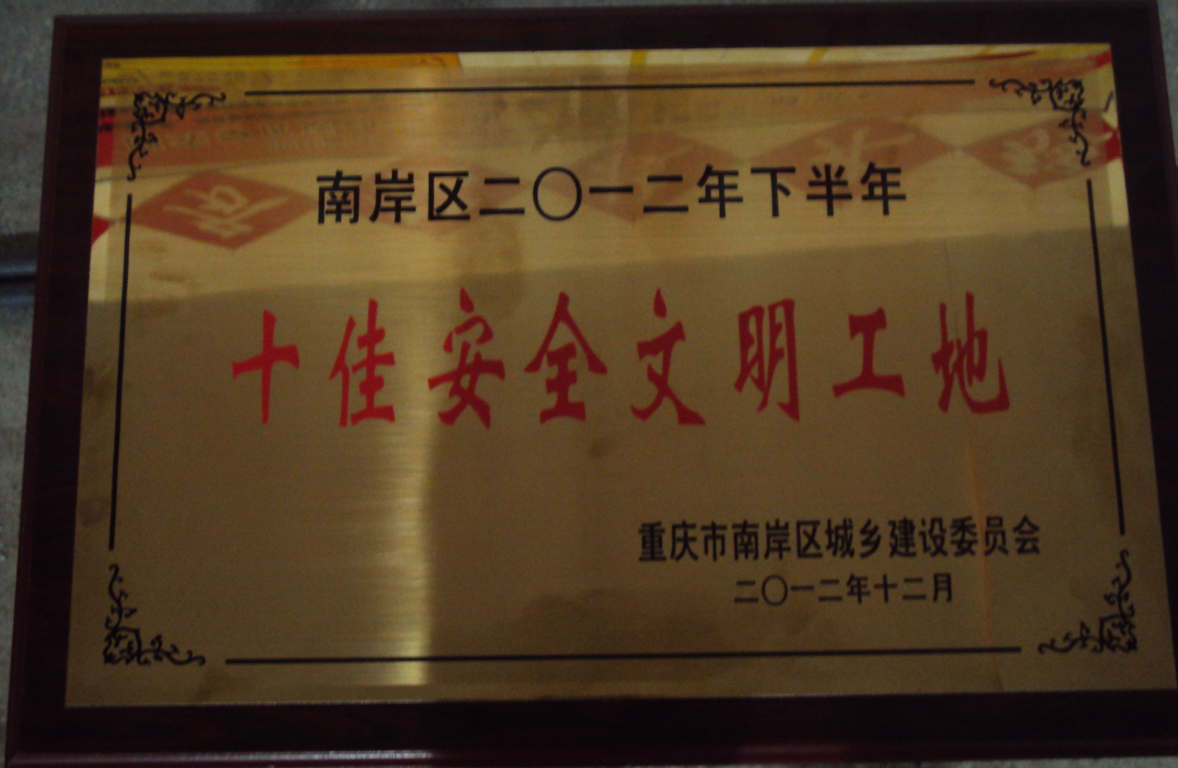 繼2012年上半年被評為南岸區(qū)“十佳安全文明工地”之后,我司參建的“重慶市區(qū)域性國家級交通科技創(chuàng)新基地服務配套區(qū)”項目,目前再獲南岸區(qū)2012年下半年“十佳安全文明工地”稱號。